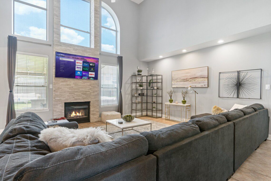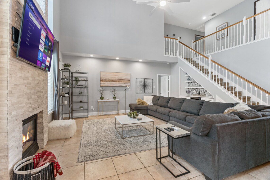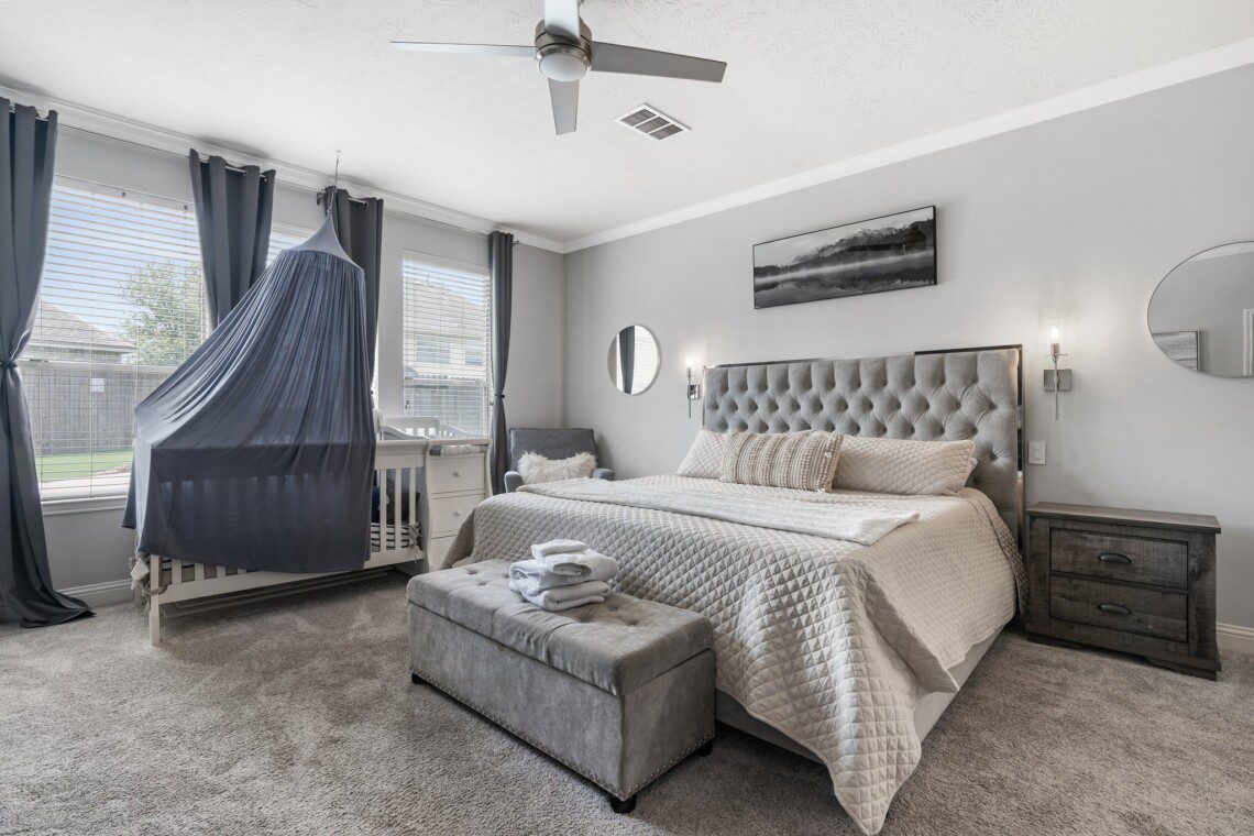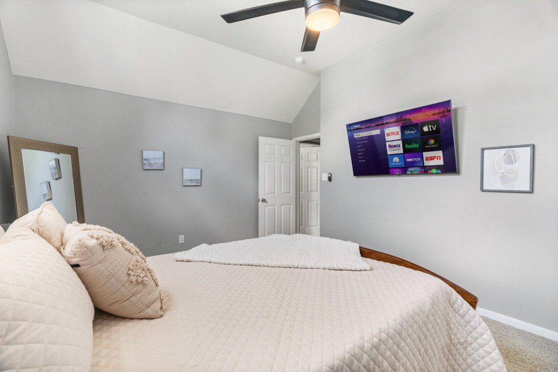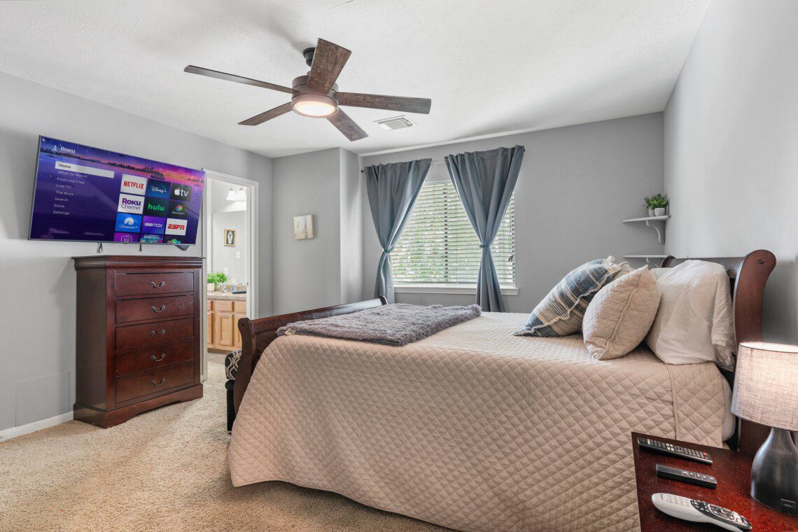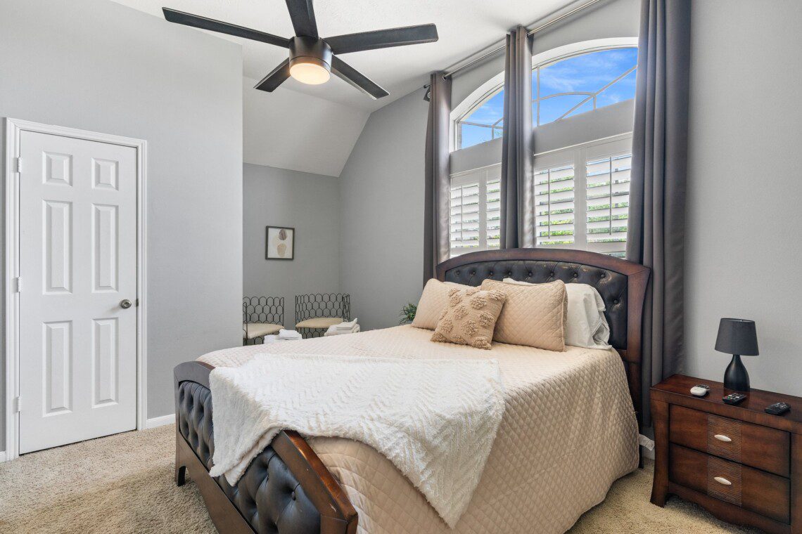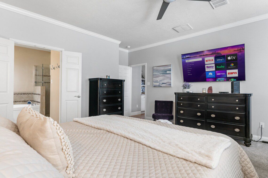 5 bedroom home, the master has a king bed , while all the other beds are queen size. One of the bedrooms has 2 queen beds in there. There is also a crib located in the master bedroom. When you walk in you have the formal living room where you can sit down and talk or play the piano. Upstairs are the 4 bedrooms and the theater and game room are also located there.