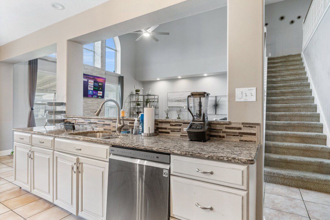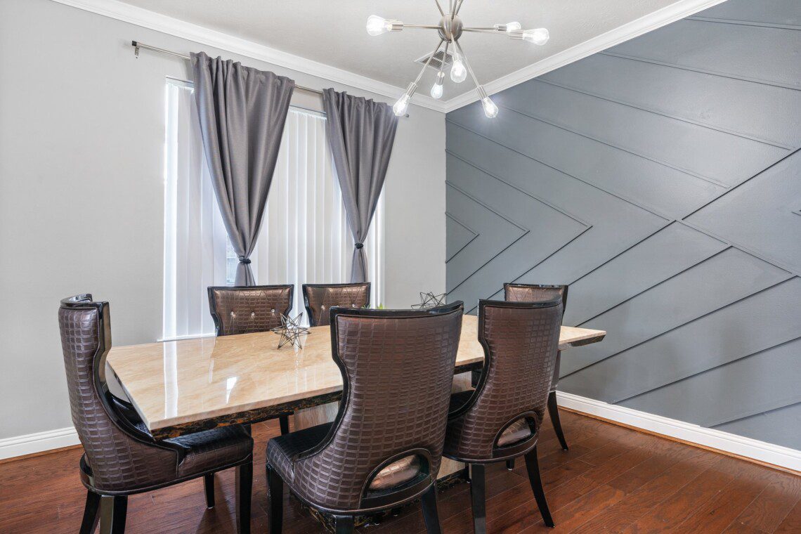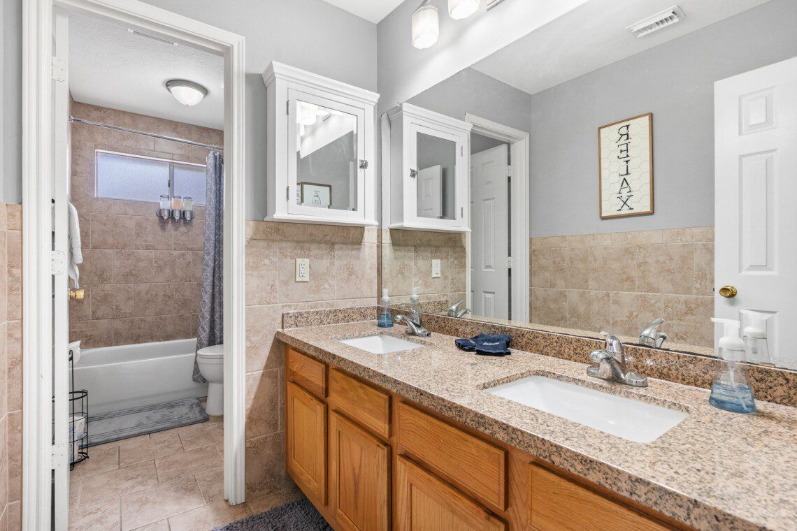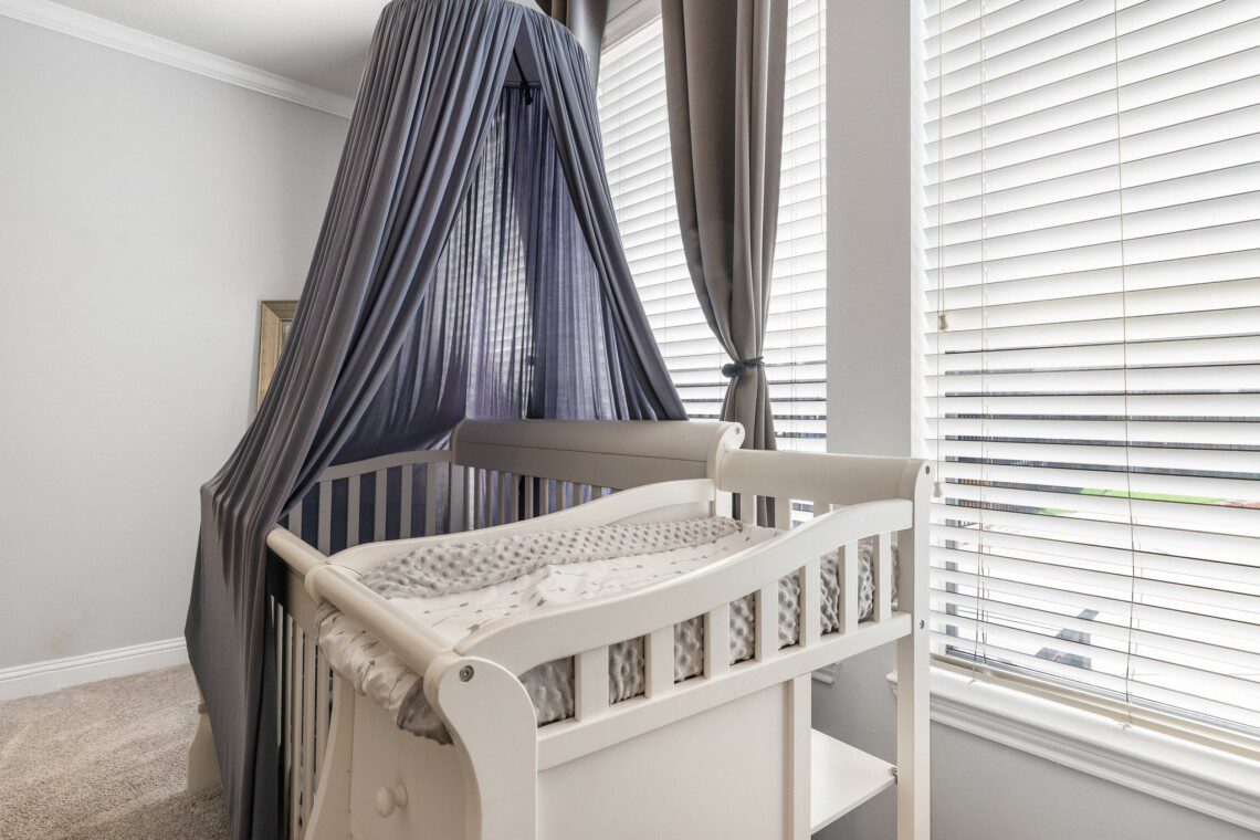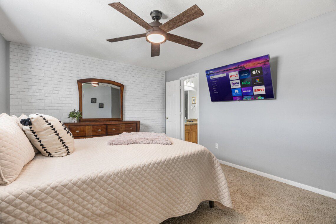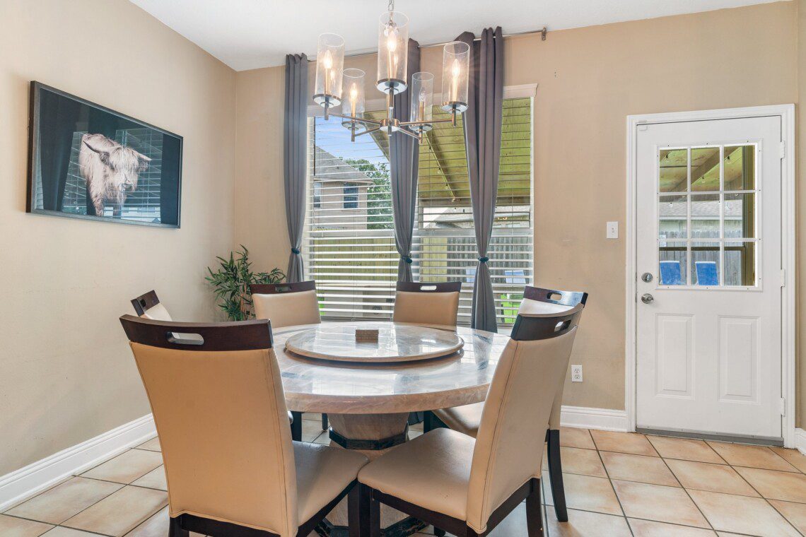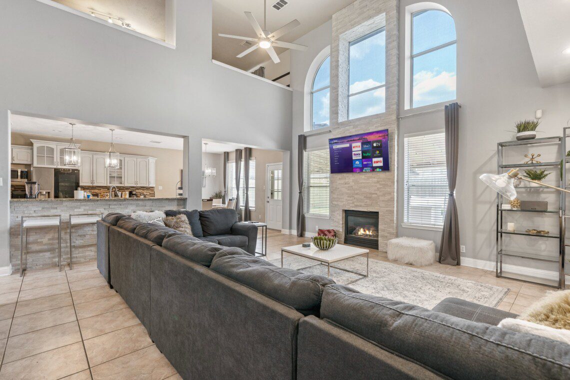 5 bedroom home, the master has a king bed , while all the other beds are queen size. One of the bedrooms has 2 queen beds in there. There is also a crib located in the master bedroom. When you walk in you have the formal living room where you can sit down and talk or play the piano. Upstairs are the 4 bedrooms and the theater and game room are also located there.